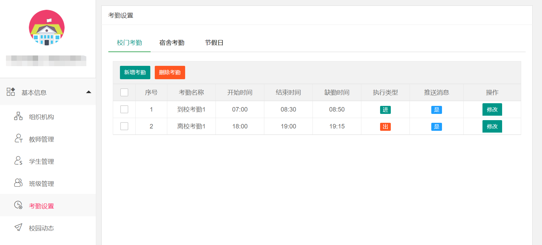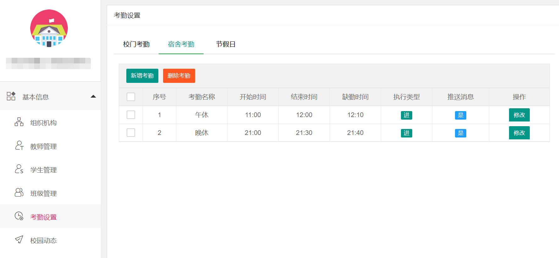 用戶可按照現實須要自界說設置考勤,別離為校門考勤設置,宿舍考勤設置,和節沐日考勤設置。