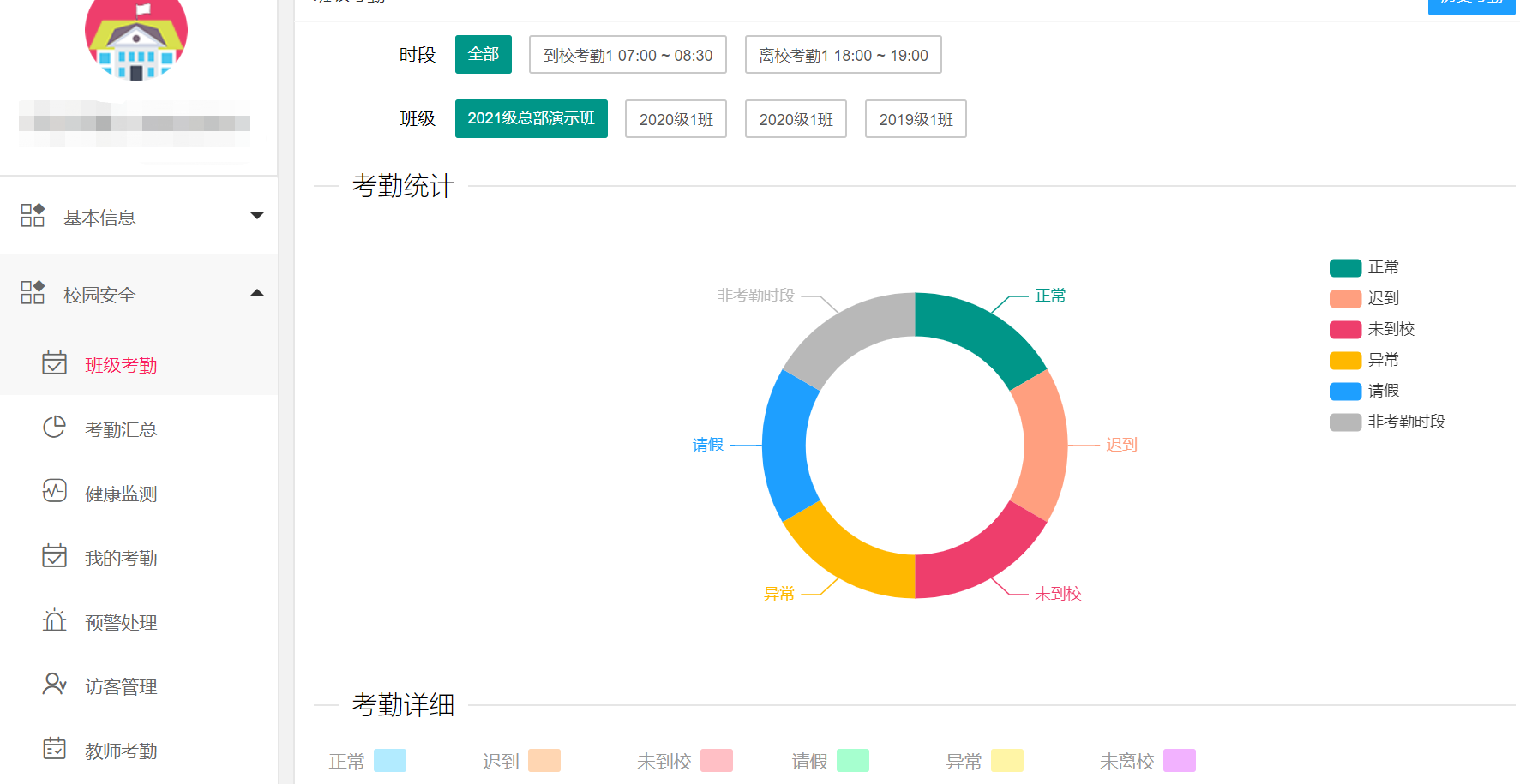 對黌舍的一切考勤數據停止匯總,停止可視化抒發,信息一目明了。